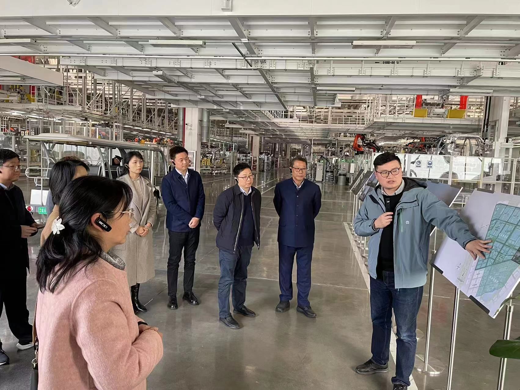 调研组一行首先参观了新桥指挥部规划馆,观看了新桥科创示范区的总体规划和建设规模沙盘。接着在讲解员的引导下先后参观了蔚来汽车F2工厂和长鑫存储技术有限公司。讲解员自豪地介绍到,蔚来汽车F2是世界级的智能电动汽车产业集群,采用了多项全自动智能设备和创新工艺,拥有机器人756台,实现连接工艺100%自动化率,是装备先进、工艺柔性、全链智能化的智能工厂,用户从订单确认到提车仅需21天,是目前全球最智化的先进汽车生产基地。长鑫存储技术有限公司也是专注于动态随机存取存储芯片(DRAM)的设计、研发、生产和销售的高科技公司。调研组成员最后参观了华侨城国际小镇。