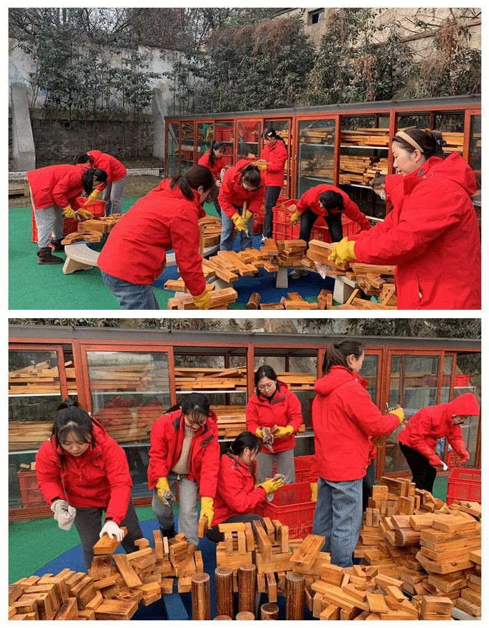 老师们利用中午午休时间,为孩子们整理户外大型建构积木。她们井然有序队的用抹布擦洗、消毒大型积木,然后进行晾晒、分类整理,干劲十足,不怕脏,不怕累,在一片欢声笑语中互相帮助、互相配合。此次活动,不仅为幼儿园营造了干净、整洁、优美、舒适的校园环境,同时也为孩子们树立了文明榜样,教师志愿者们以自己的行动书写新时代的雷锋故事。