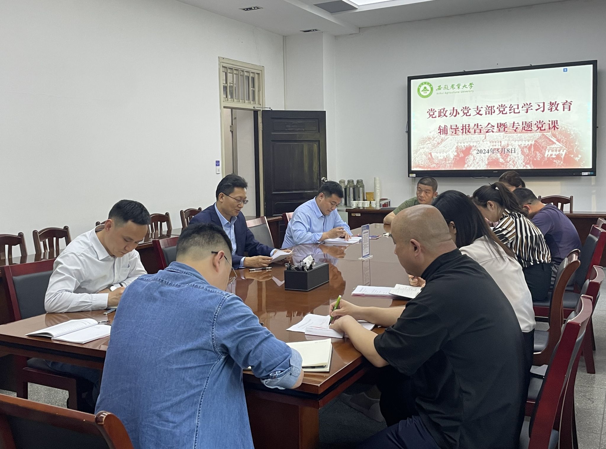 在习近平总书记到中办实地视察调研并发表重要讲话十周年之际,5月8日下午,校党委书记张庆亮以普通党员身份参加党政办党支部组织生活,为支部党员作党纪学习教育辅导报告并上专题党课。