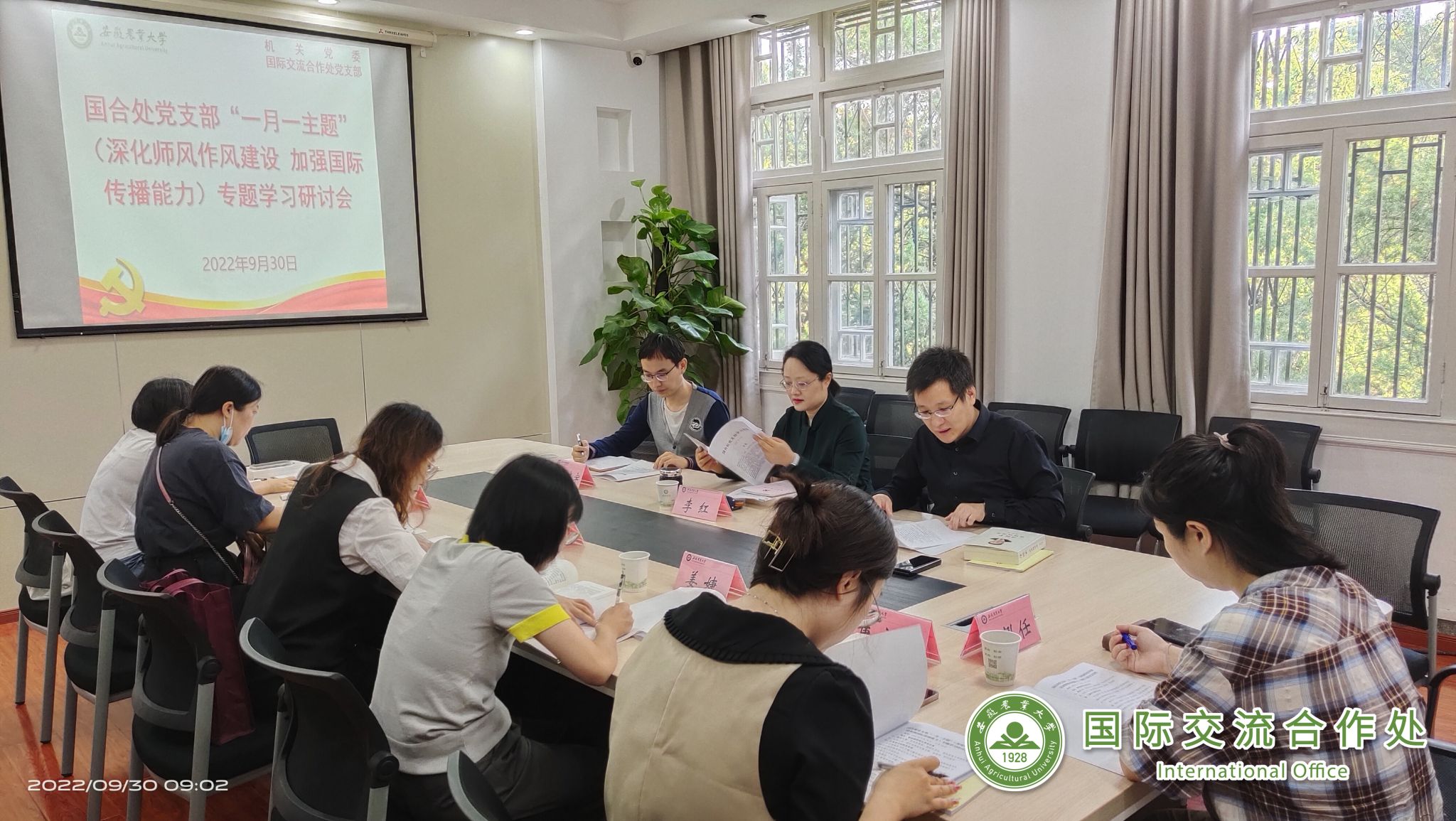 孙裴传达了《中共安徽农业大学委员会关于加强对“一把手”和领导班子监督的实施细则》(校党字〔2022〕54号)文件精神和安徽师范大学《关于给予宛勇开除党籍处分的决定》,提醒大家以案示警、以案为戒。并领学了《习近平谈治国理政》第四卷节选(P316)“加强国际传播能力建设,展示真实、立体、全面的中国”,号召要积极开展各种形式的人文交流活动,提升新时代国际传播能力,努力塑造可信、可爱、可敬的中国形象。