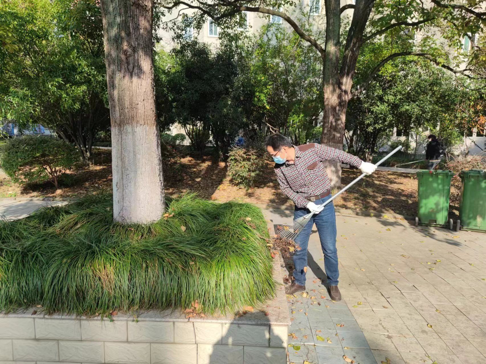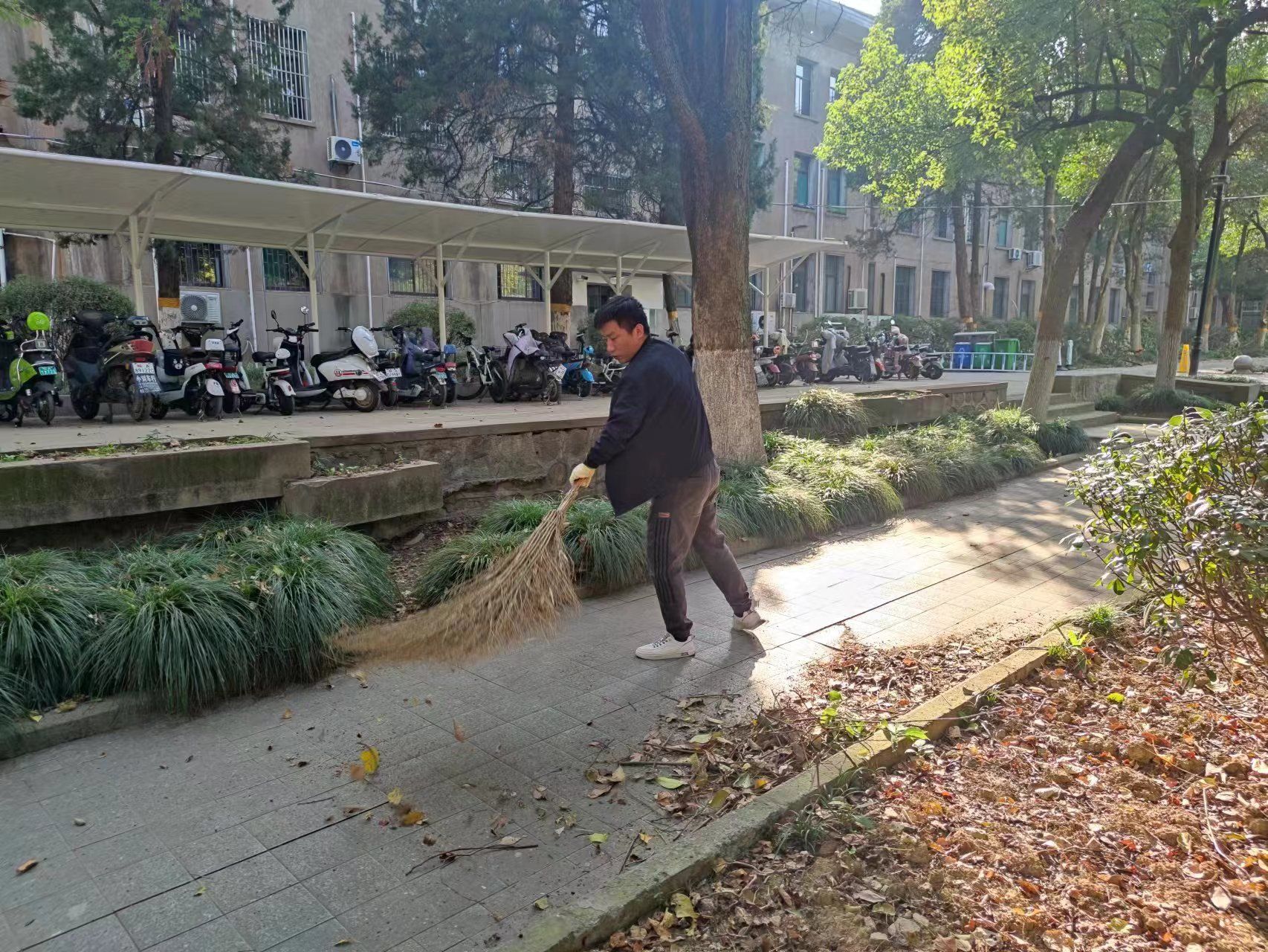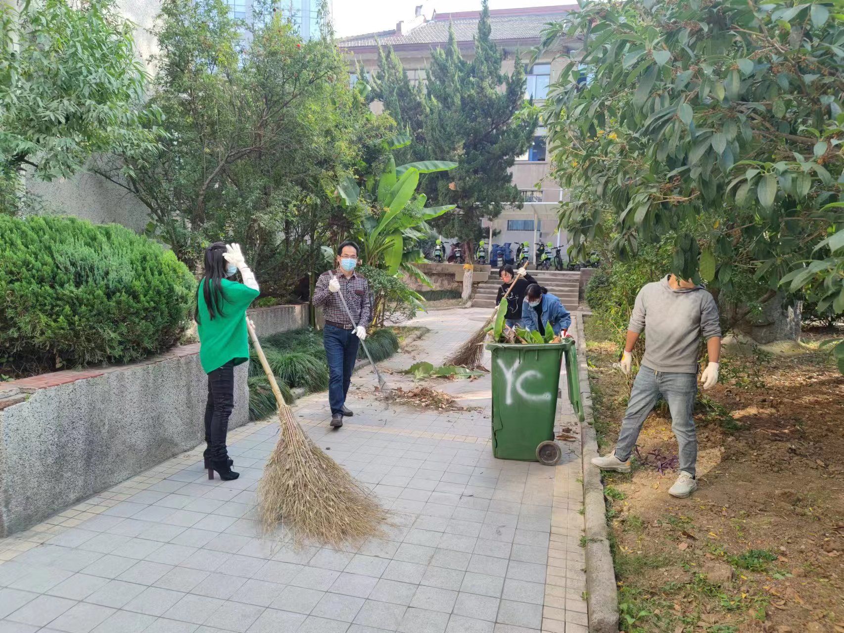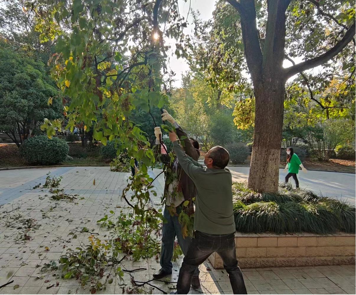 活动中,党员干部冲锋在前、全体职工紧随其后,大家发扬不怕苦、不怕累的精神,深入到成教楼周边广场的每个角落,有的用铁锹铲除杂草、砖块,有的用扫帚清扫路面,有的用剪刀修剪树枝,有的用镰刀、斧头砍树枝,有的将草层中捡出来的废纸、塑料袋等装入垃圾桶。经过近2个小时的努力,成教楼周边的杂草、杂物、垃圾等被清理的干干净净,整个楼宇周边焕然一新,主干道干净整洁,人行小道显得更加通透。