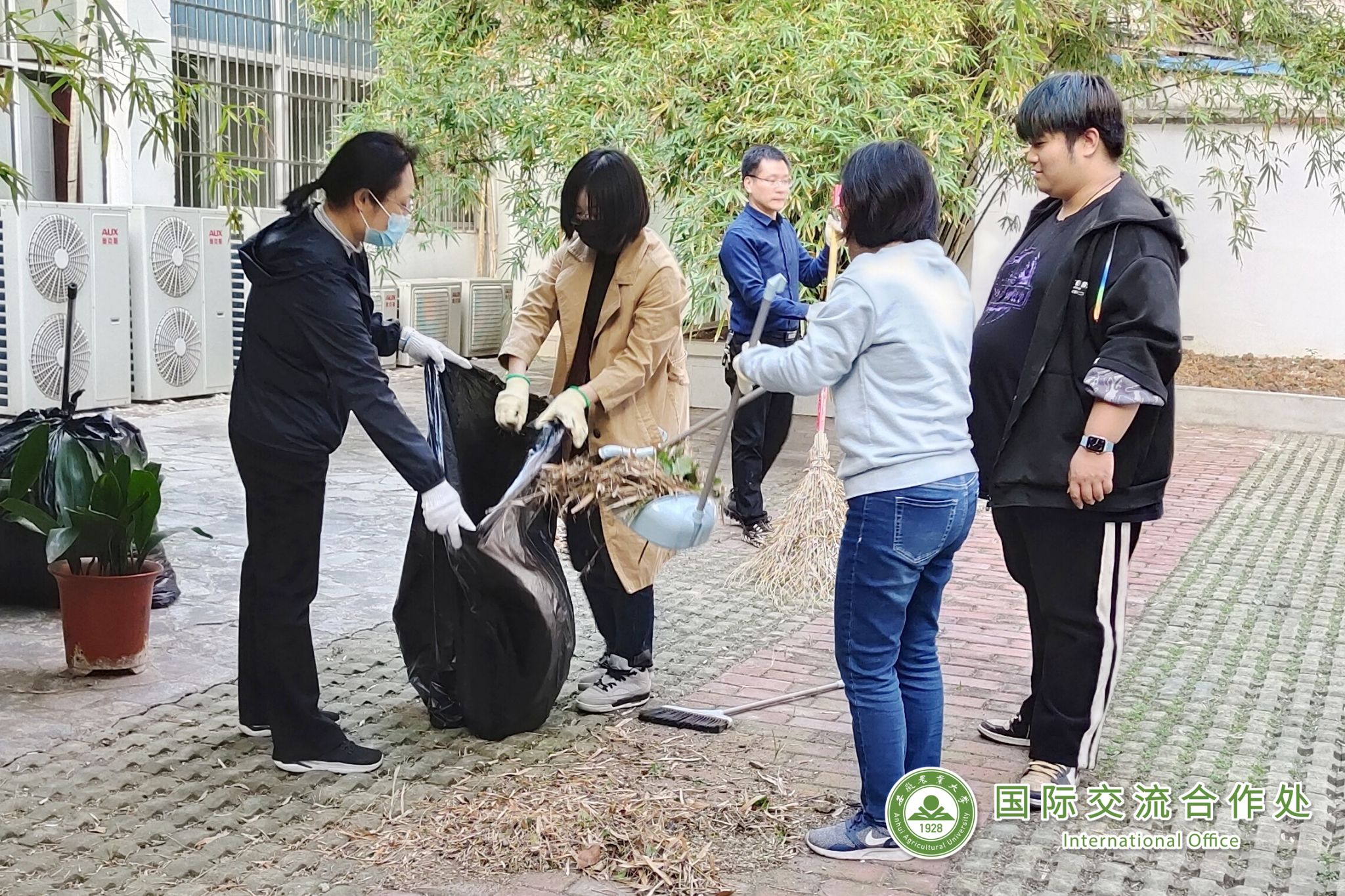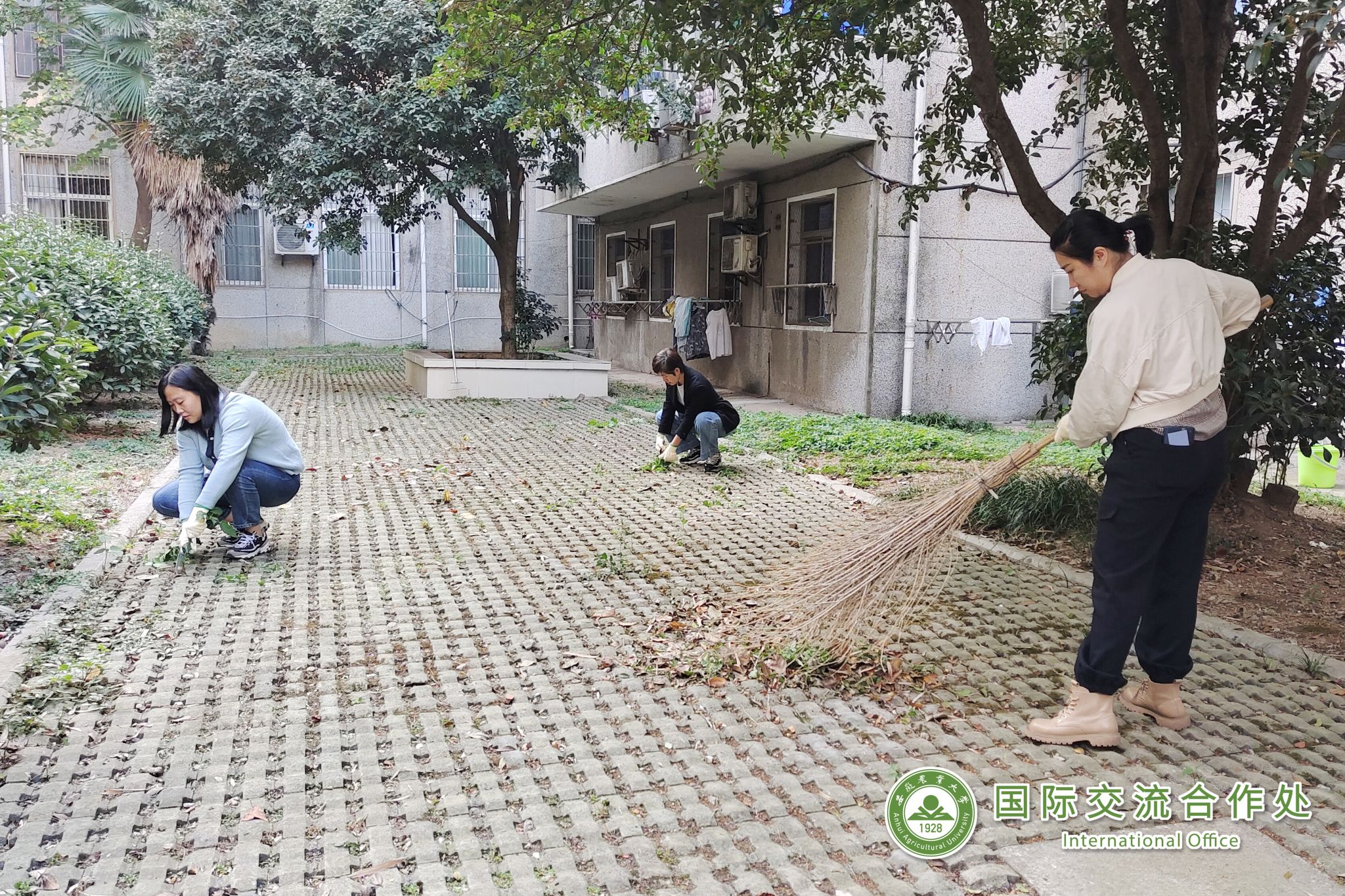 活动中,党员领导干部以身作则,带头发扬不怕脏、不怕苦、不怕累的精神,国合处全体教职工紧随其后,大家有的用扫帚清扫院落,有的用锯子修剪树枝,有的用剪刀清理杂草,有的用抹布擦拭桌椅,有的用耙子清除落叶和垃圾……经过近2个小时的劳动,学生公寓前、后院的每个角落被全面清扫无死角,周边显得干净整洁,更加通透。