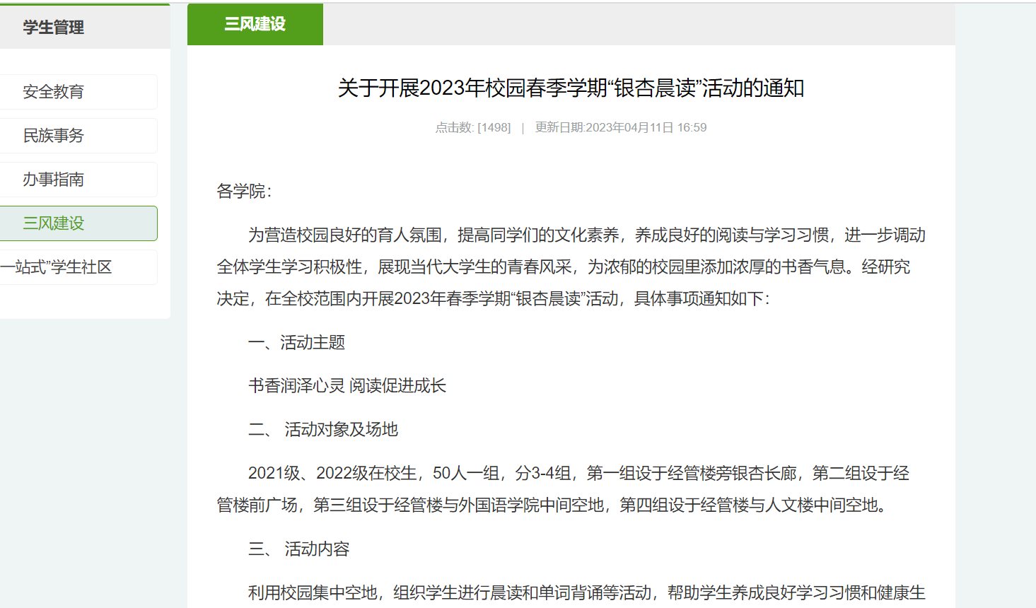 依托晨读和晚自习等活动载体,培养学生良好学习习惯,增强学生的专业认同感,厚植学农爱农知农情怀。通过“读党史、颂名著、乐分享、畅交流”银杏晨读活动,引导学生“多读书、好读书、读好书”。晨读活动已累计举办7期,吸引2000余人次参与。在全体新生中开展集体晚自习活动,培养习惯养成,为学风建设打好基础。期间,学校领导、校直有关部门负责人及各学院领导多次到晚自习教室查看新生晚自习情况,有力保障晚自习质量。