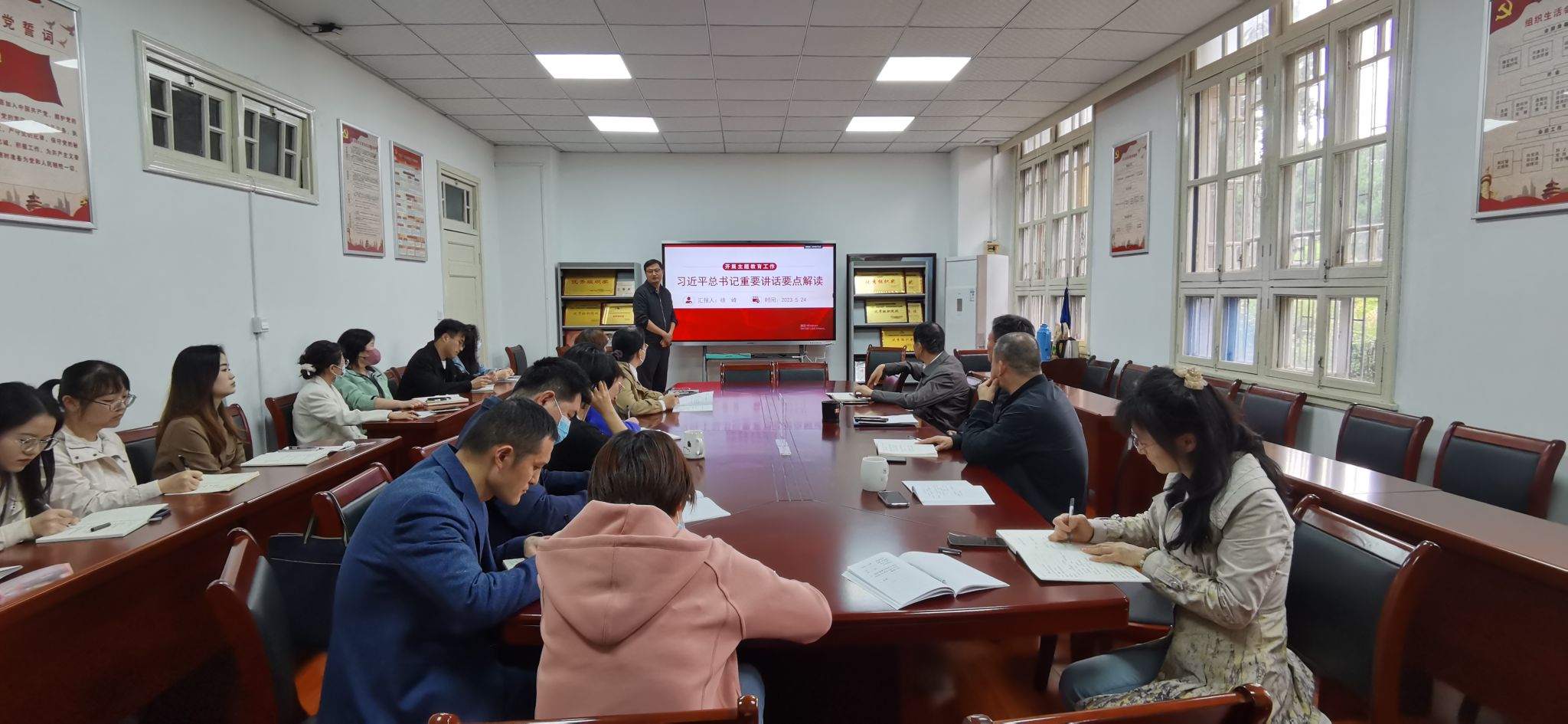 党课开始前,党员们集中观看了2020年8月习近平总书记在安徽考察时的新闻报道视频。之后,教务处副处长徐峰从开展主题教育的学习目的、重要意义、总要求、根本任务、学习方法、如何落实等六个方面展开论述,为大家上了一堂题为“习近平总书记重要讲话要点解读”的生动党课。