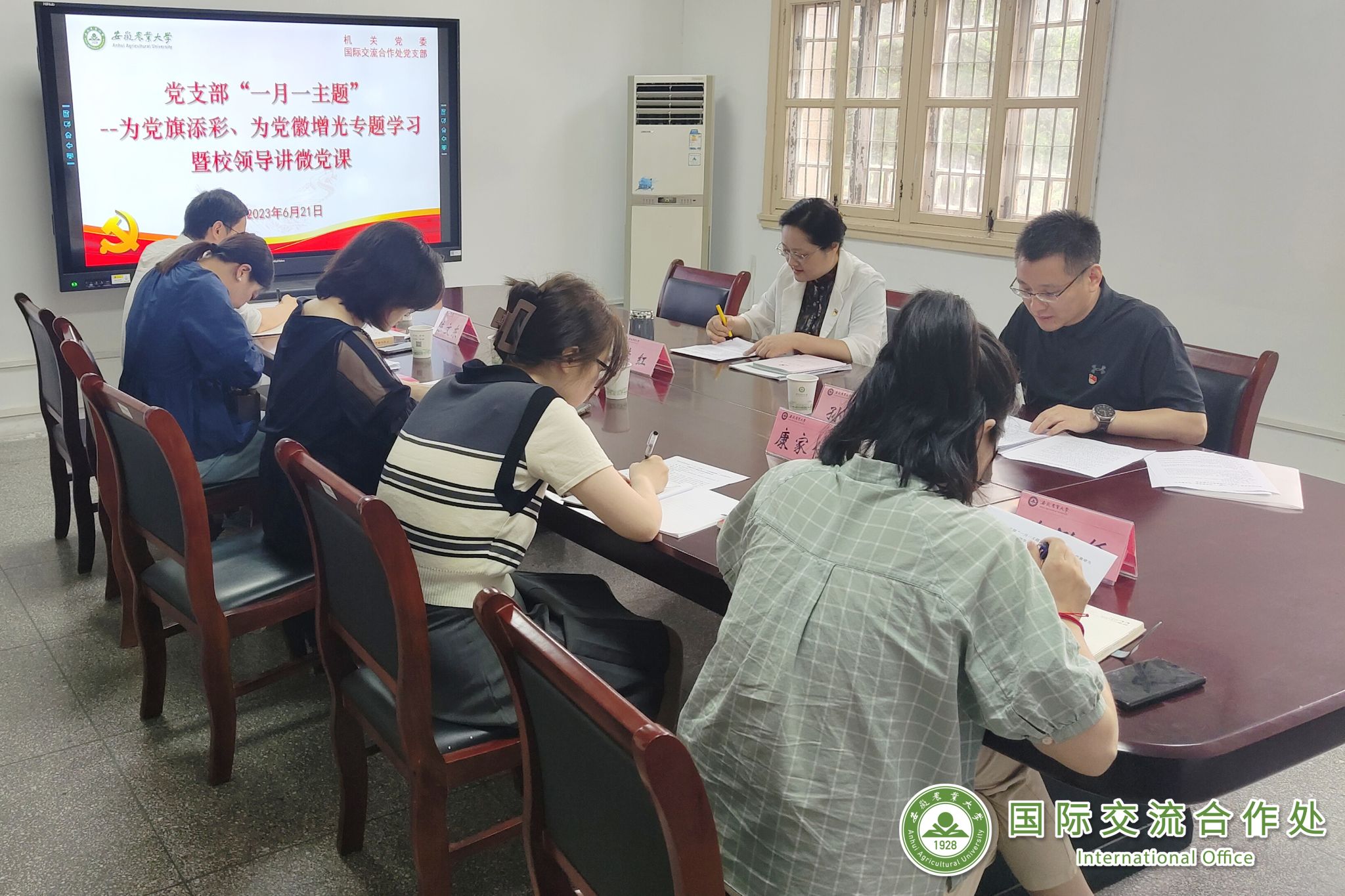 6月21日,国合处党支部开展“一月一主题”---为党旗添彩、为党徽增光专题学习暨校领导讲微党课。校党委常委、副校长李红同志以普通党员身份参加所在党支部组织生活。会议由支部书记孙裴同志主持。