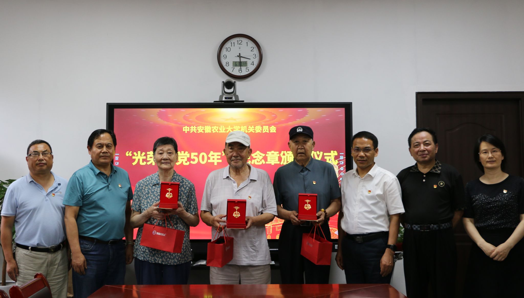 刘凯代表机关党委向获颁“光荣在党50年”纪念章的老同志们表示崇高的敬意,颁发纪念章仪式是对机关广大党员的一次深刻党性教育。老同志们多年心系学校发展,支持学校建设,以实际行动践行对党的誓言。机关干部要以老党员为标杆,从“光荣在党50年”纪念章颁发活动中感悟初心召唤、坚定使命追求,为学校特色高水平农业大学建设贡献力量。