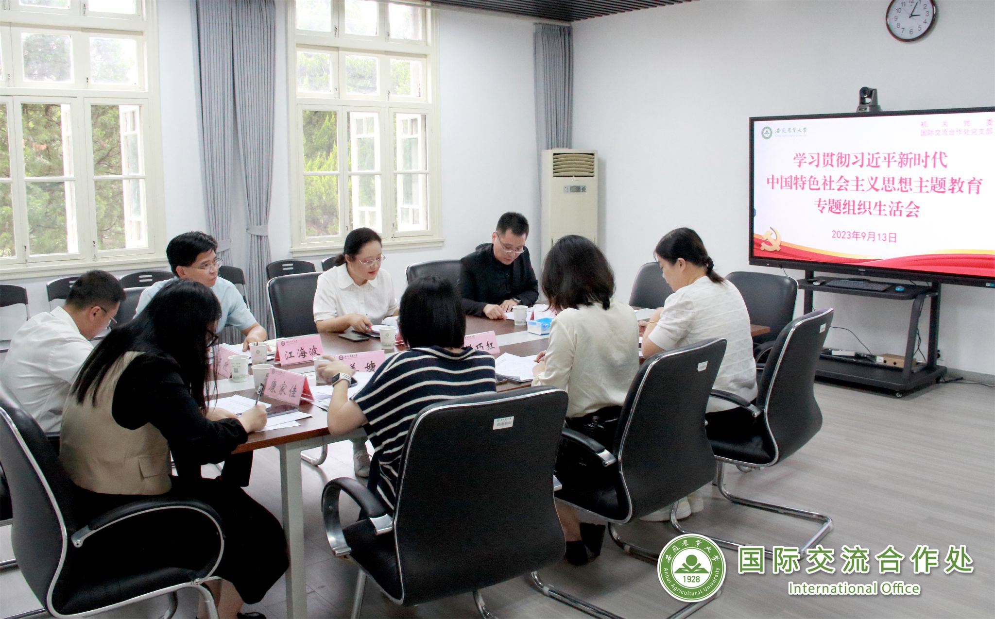 近日,国合处党支部召开2023年度学习贯彻习近平新时代中国特色社会主义思想主题教育专题组织生活会。校党委常委、副校长李红以普通党员身份参加组织生活会,机关纪委委员、总务部部长江海波到会联系指导,会议由党支部书记孙裴主持。