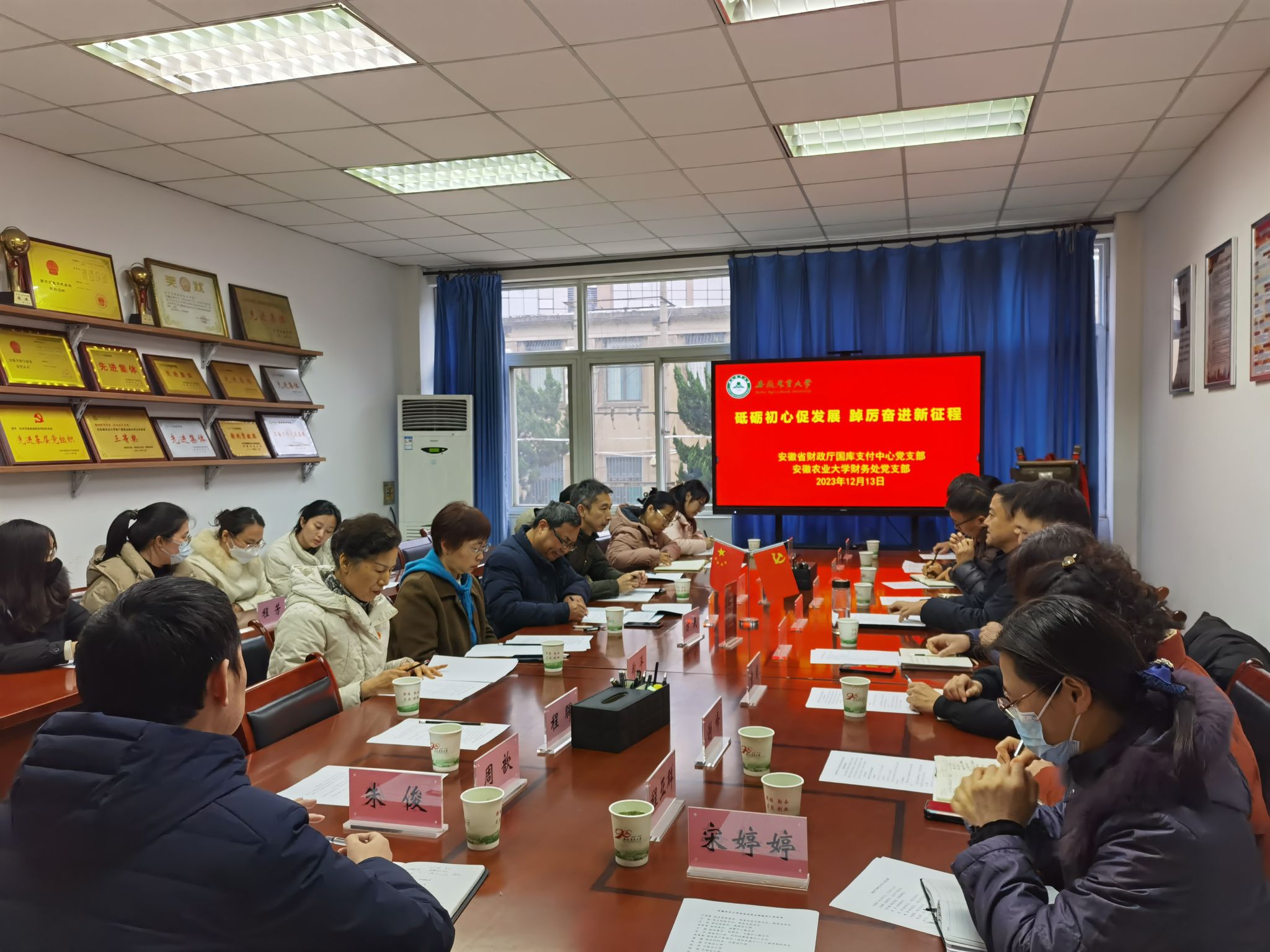 12月13日下午,财务处党支部与财政厅国库支付中心党支部联合开展以“砥砺初心促发展 踔厉奋进新征程”为主题的支部共建活动。财政厅国库支付中心党支部书记、主任李德军一行11人、财务处党支部全体在职党员和国资处有关人员参加共建活动。共建活动分为参观和座谈两个部分。