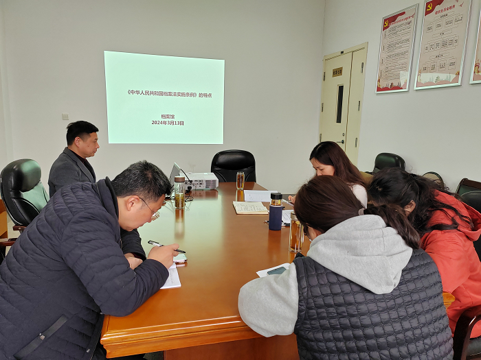 党支部书记刘社文带领大家对《实施条例》中的条款进行专题学习,对档案机构及其职责、档案的管理、档案的利用和公布、档案信息化建设和监督检查等修改章节进行了重点解读。
