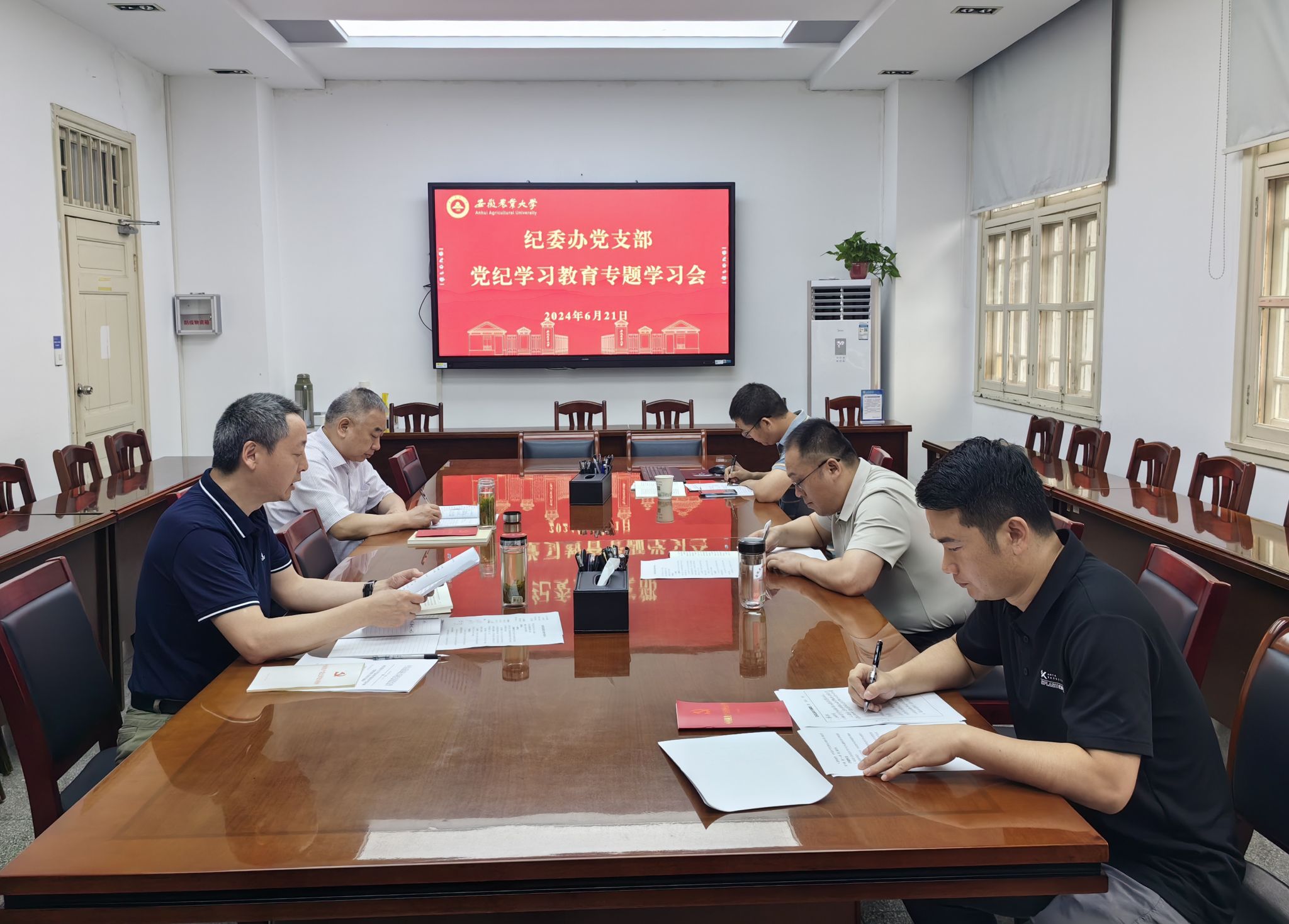 6月21日下午,纪委办党支部在第一会议室召开党纪学习教育专题学习会,开展集体过政治生日活动。校党委常委、纪委书记、监察专员陈文兵以普通党员身份参加学习会。会议由党支部书记彭庆刚主持。