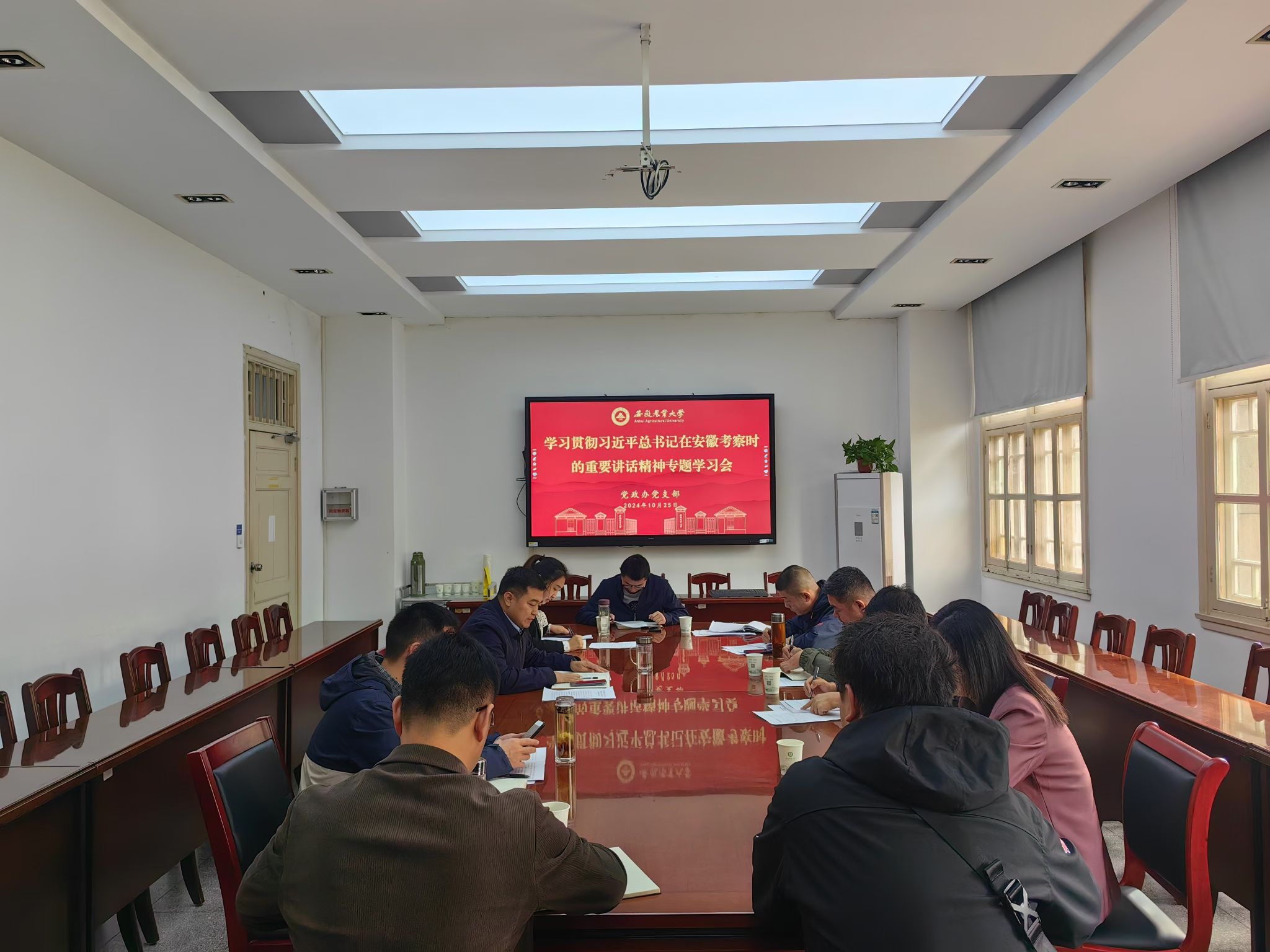 10月25日上午,党政办党支部召开“一月一主题”学习会,专题学习习近平总书记在安徽考察时的重要讲话精神,会议由党支部书记戴照力主持。
