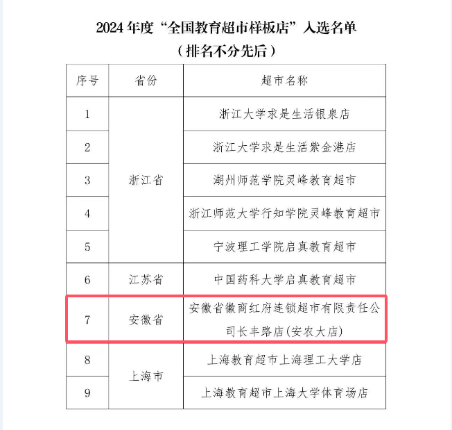 1月7日,资产经营公司党支部服务单位红府超市(东门店)经中国教育后勤协会商贸管理专业委员会评选,成功入选2024年度“全国教育超市样板店”名单,成为安徽省域唯一首次获此荣誉的高校校园超市。