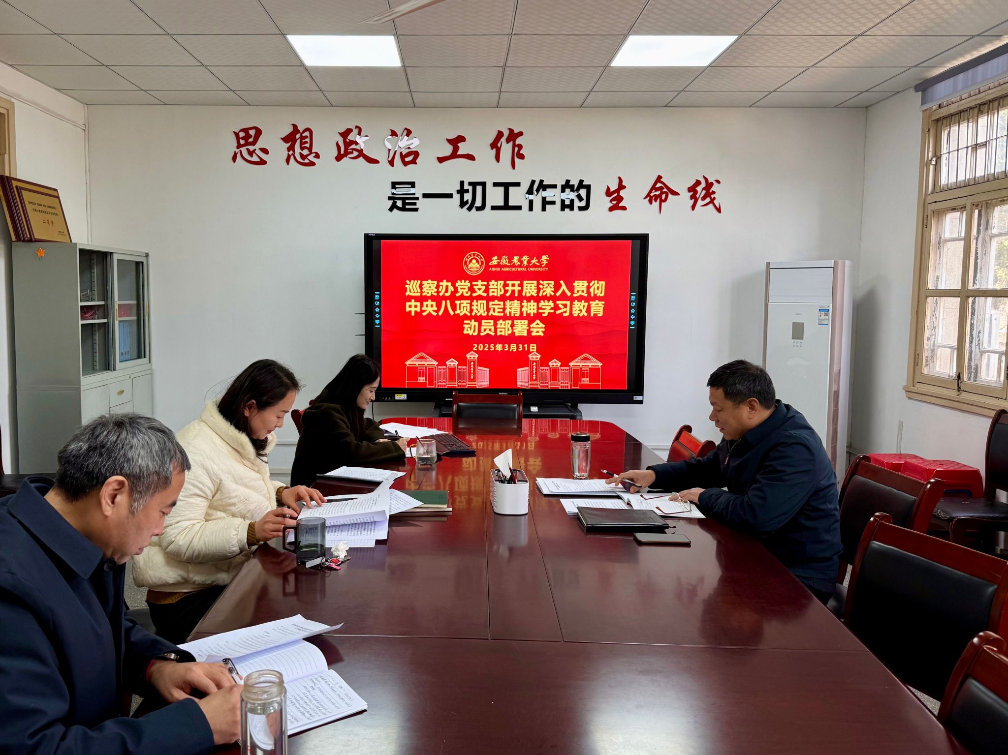 会议还学习了习近平总书记在2025年全国两会期间重要讲话精神、安徽省委一号文件、全省教育系统全面从严治党工作视频会议精神以及校七届八次党代会、七届五次教代会、十届五次工代会暨2025年全面从严治党工作会议精神等。集中观看了视频党课——《突出政治定位 推进新时代巡视工作高质量发展》》。(文/图/许漩 编辑/徐玉品 预审/邹兴业 审核/葛红)