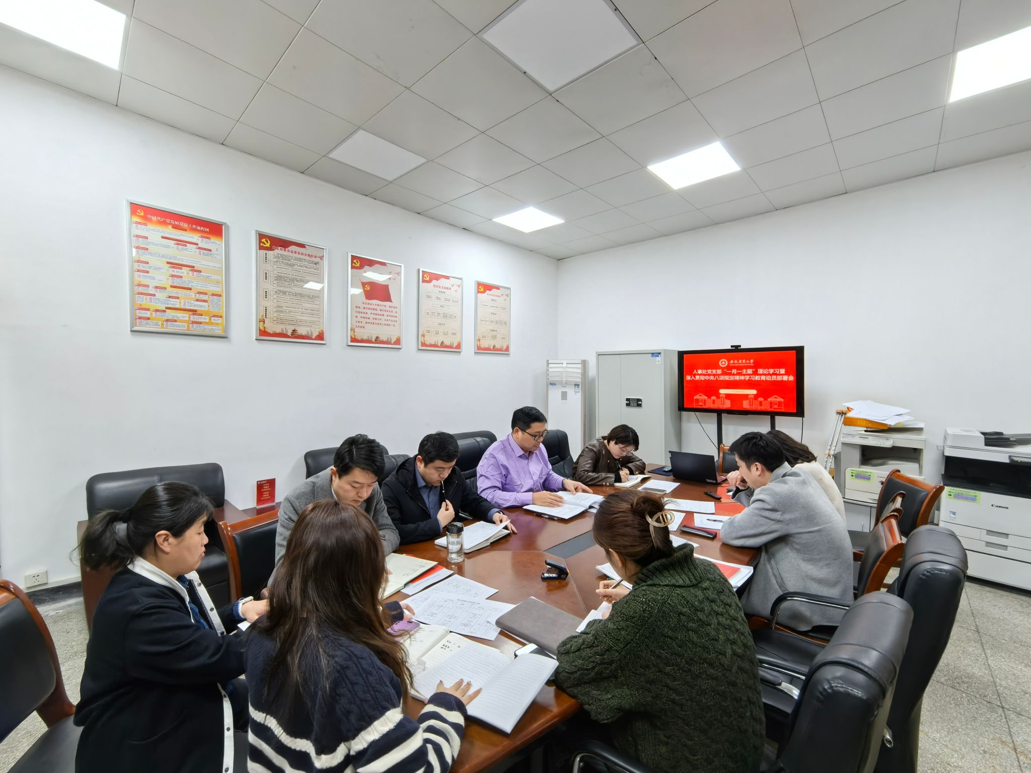 4月1日下午,人事处党支部召开“一月一主题”理论学习会暨深入贯彻中央八项规定精神学习教育部署会。会议由党支部书记俞杰主持,全体党员参加。