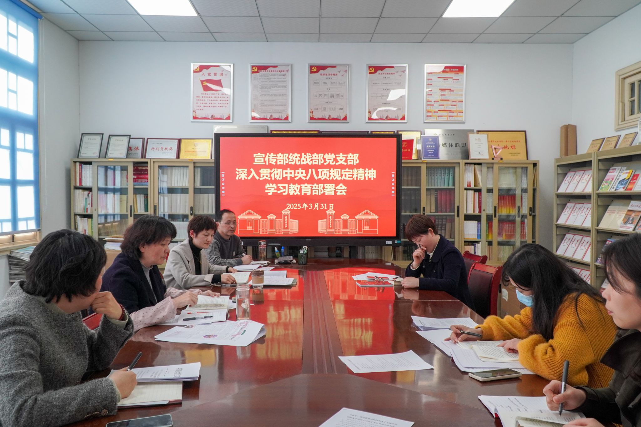 3月31日上午,宣传部统战部党支部开展“一月一主题”学习,动员部署开展深入贯彻中央八项规定精神学习教育。会议由党支部书记姚莉主持,支部全体人员参会。
