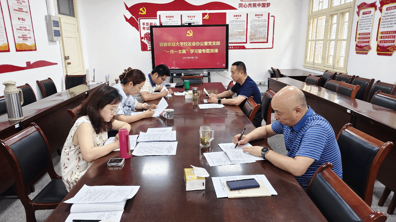 6月11日下午,校友会办公室党支部开展“一月一主题”学习会暨专题党课,会议由党支部书记刘海涛主持,全体党员参加会议。