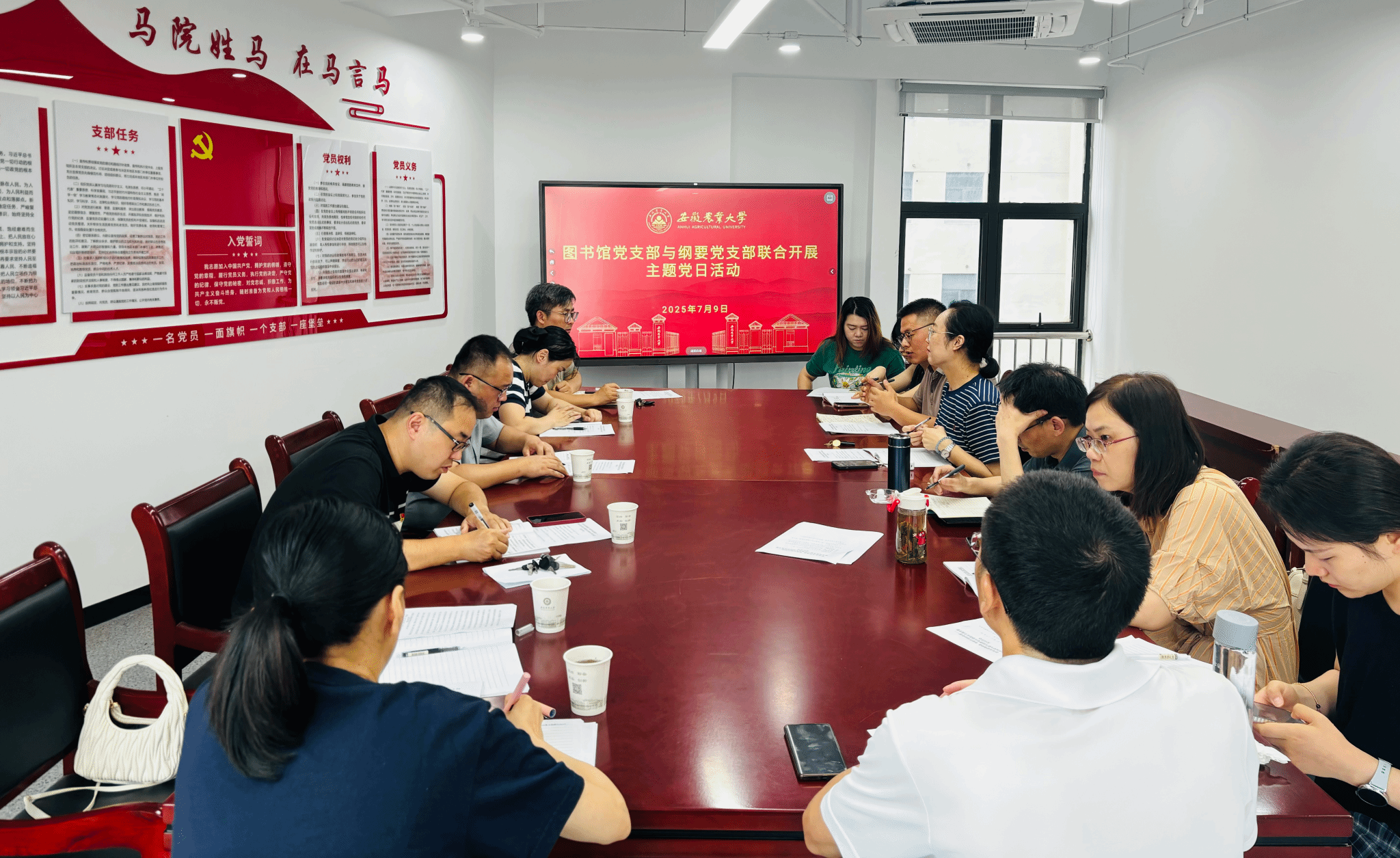 7月9日上午,图书馆党支部与中国近现代史纲要党支部开展共建交流活动。图书馆党支部书记裴顺、中国近现代史纲要党支部书记颜莉及双方支部党员参加活动,活动由颜莉主持。