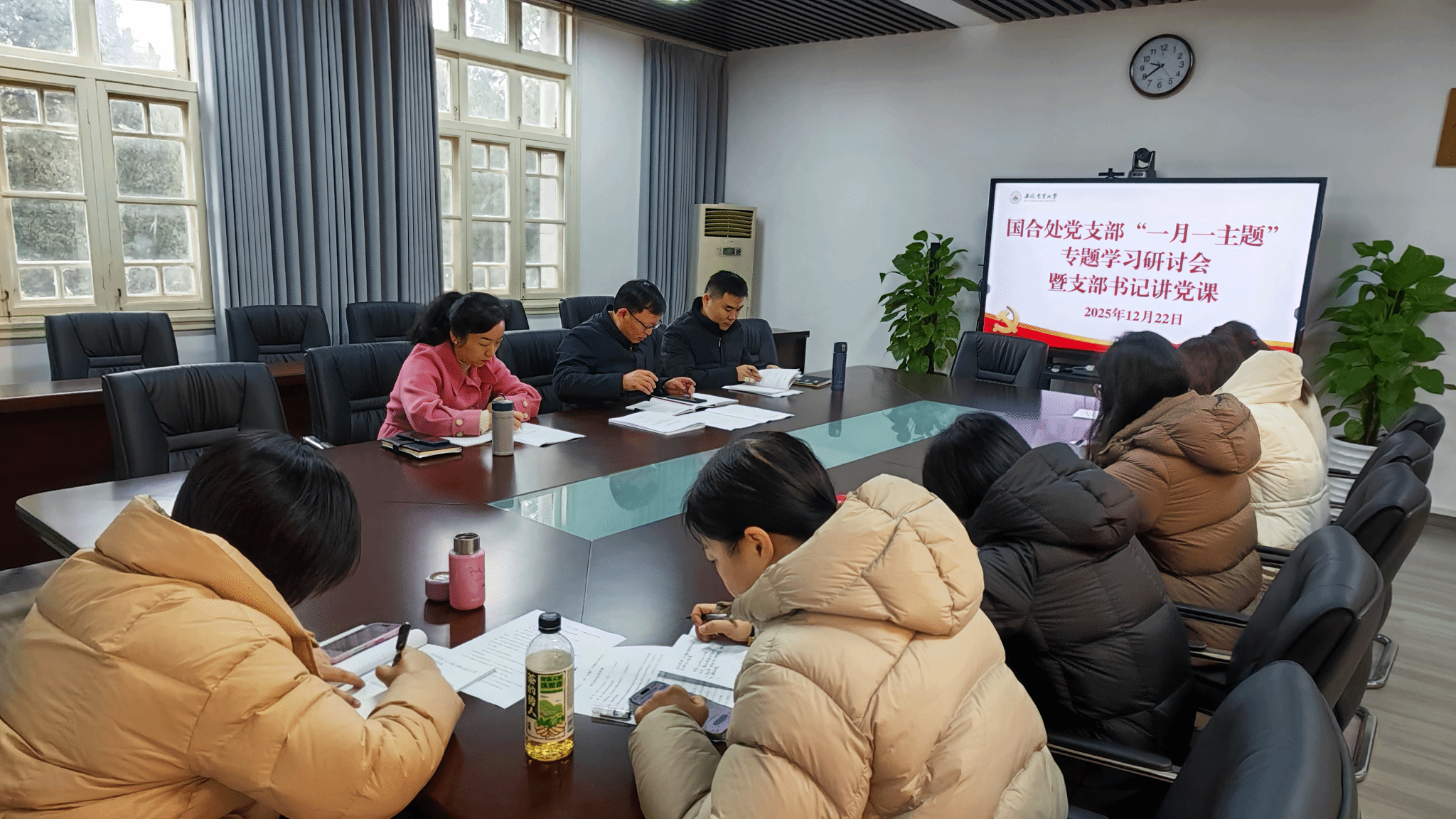 2025年12月22日上午,国合处党支部开展了“书记讲党课”暨第三次集中大课学习研讨会,会议由支部书记李大祥主持。