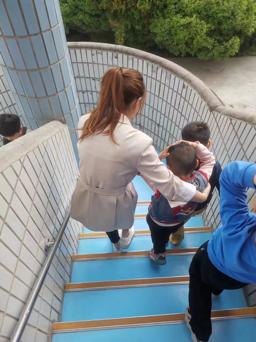 大二班陆昕老师在幼儿园进行地震演练时,紧紧的护住跟不上队伍的孩子,防止孩子因为人多拥挤而摔倒。