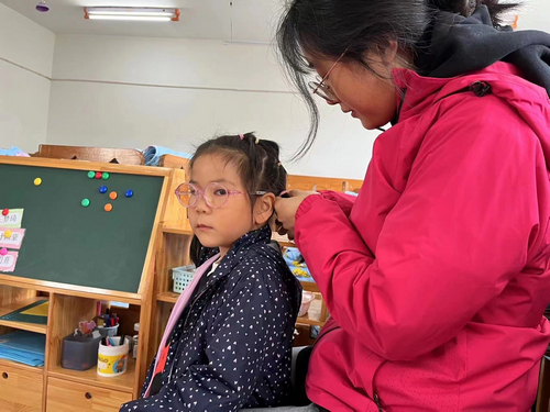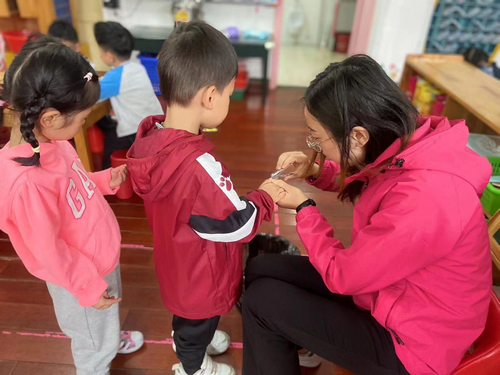 天气变化无常,许多孩子都因此染上了风寒,中三班徐珊惠老师发现有个孩子户外活动后回到教室开始打喷嚏,赶紧帮她穿好了衣服,还小心地帮她擦掉了鼻涕。