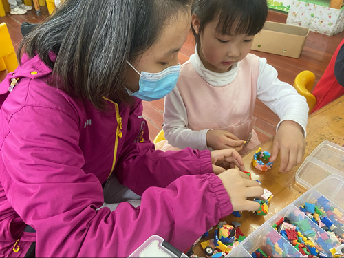 大三班李雨露老师在孩子进行桌面游戏时,走过去夸奖了孩子的“作品”,并尝试与她一起拼搭。