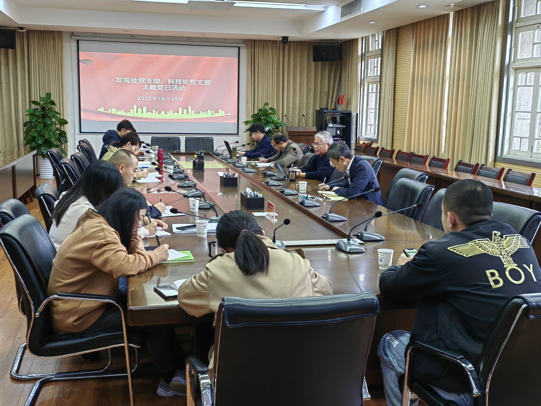 10月28日下午,发展规划处党支部、科技处党支部联合在第三会议室开展支部书记讲党课活动,发展规划处党支部书记方明应邀为支部党员作了题为《中国式现代化背景下的教育现代化》的解读报告。活动由科技处党支部书记王瑞主持,两个支部全体党员参加。