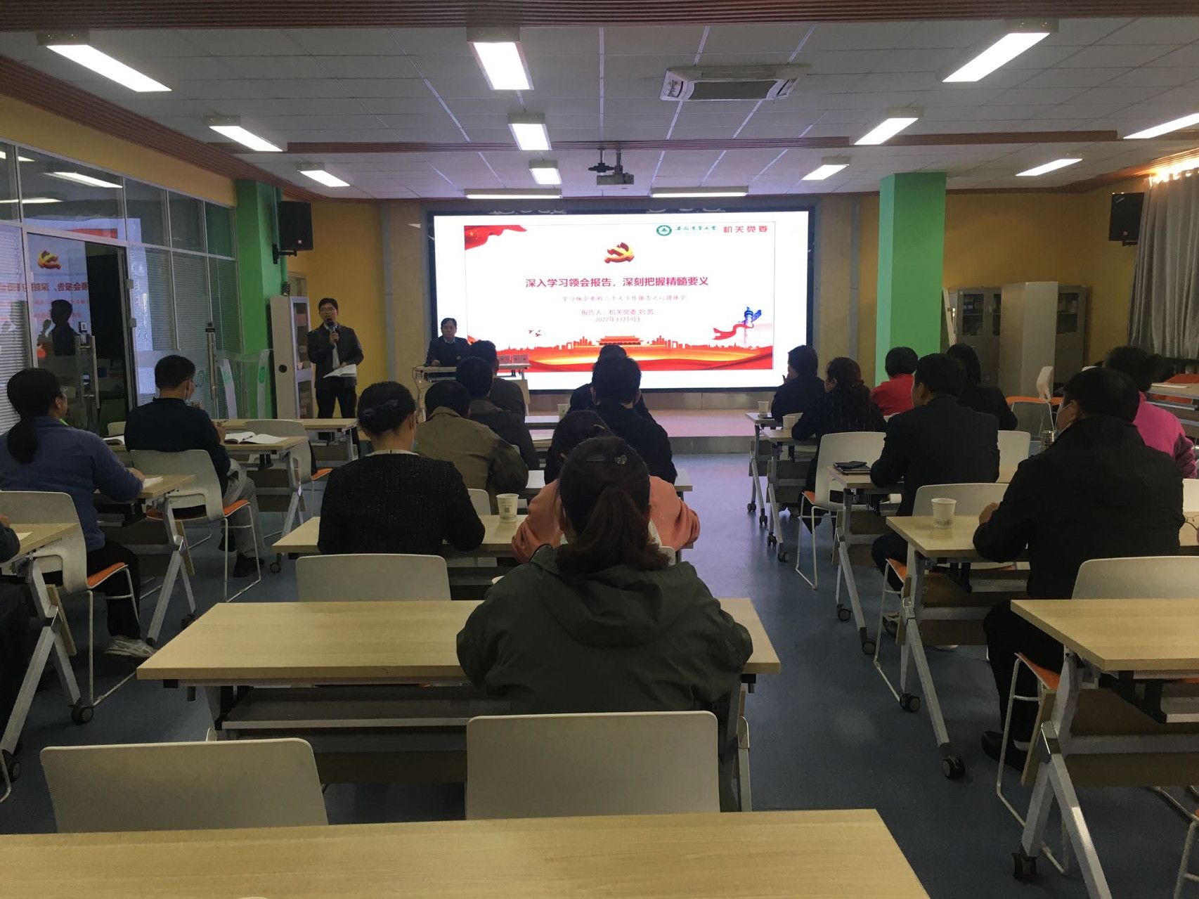 11月9日下午,机关党委书记刘凯为后勤保障处5个支部全体党员作题为《深入学习领会报告 深刻把握精髓要义》辅导报告,党课由后勤保障处副处长(主持工作)江海波主持。