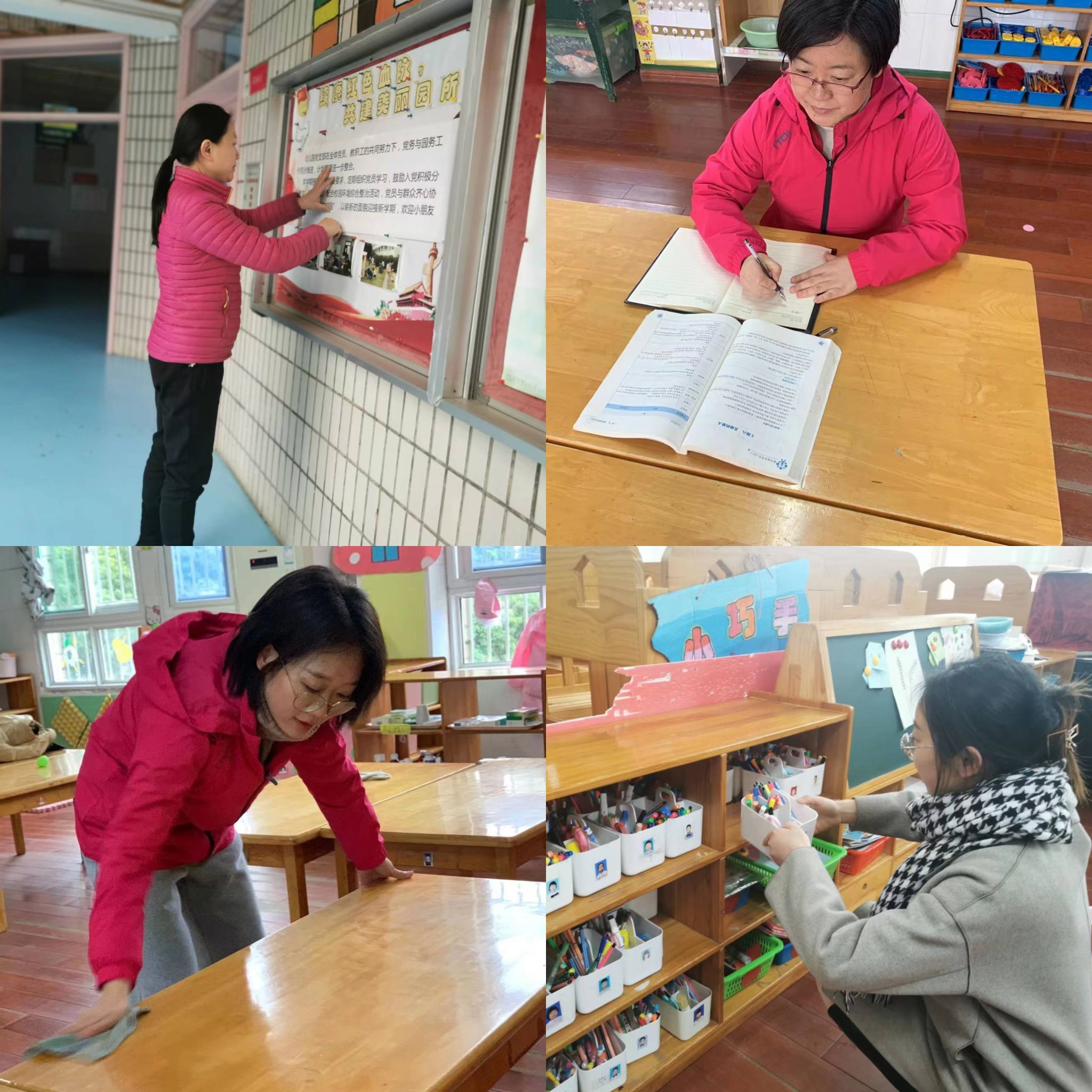 幼儿园党支部组织党员对幼儿园室内外、食堂环境进行全面清扫,做好桌椅、玩具、图书、炊餐具等物品消毒;在幼儿返校前围绕师德师风、教育教学、卫生保健、班级工作、家长工作、安全工作、食堂工作分批开展培训工作;围绕开学主题活动布置室内环境,制定各项计划,备好超周计划课,准备教具、做好各项教学准备。