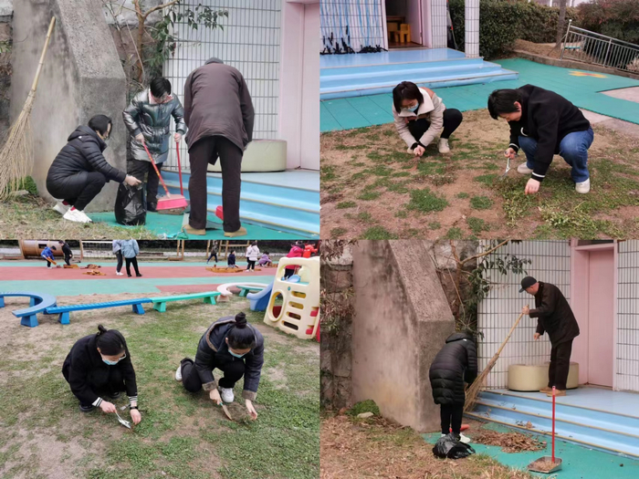 会议结束后,全体党员开展“爱国卫生我先行,清净环境净校园”主题党日活动。大家纷纷拿起铲子、扫把、爪耙等各种工具,齐心协力,对幼儿园活动草坪杂草和枯枝落叶进行全面细致的了清理。大家热情饱满,不怕累,不怕脏,争先领头干起活。