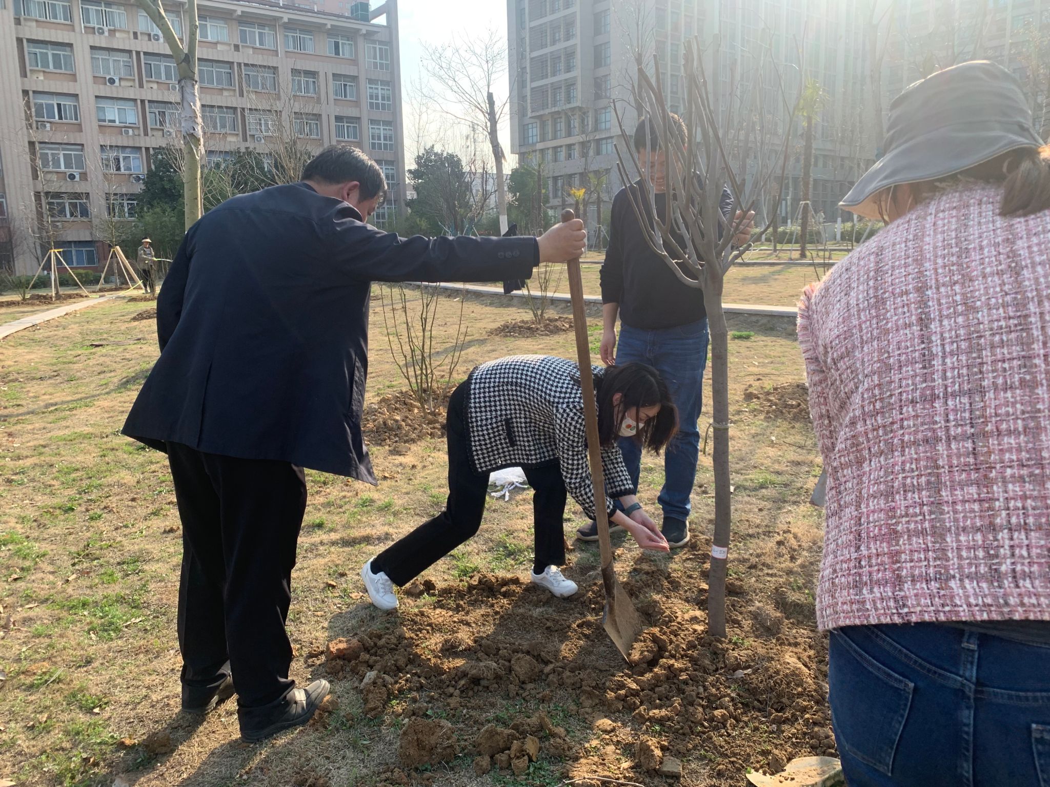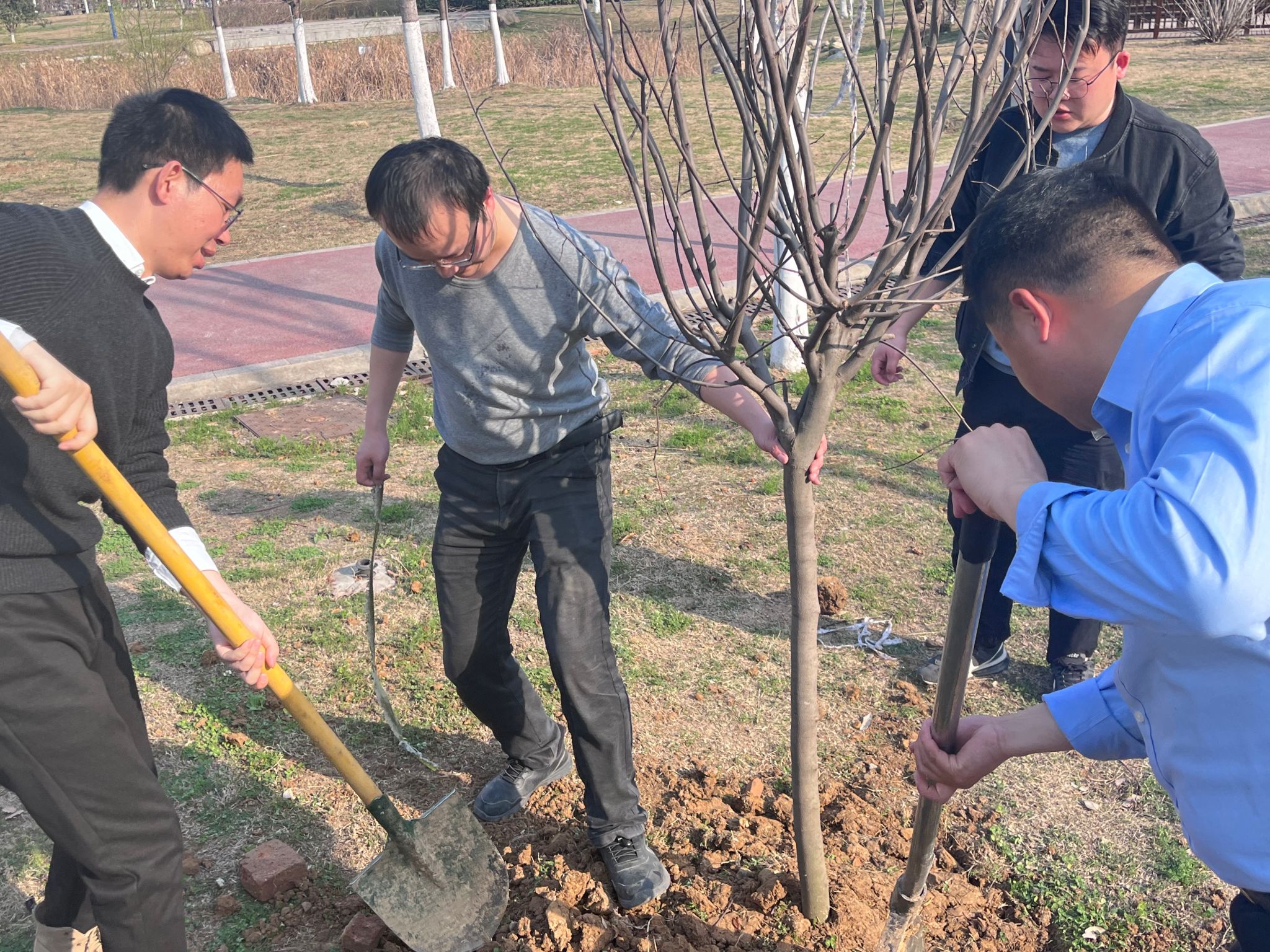 活动现场成员们分工协作、配合默契,现场热火朝天,有的挥锹挖土,有的扶树培土,有的踩土浇树,大家充满热情,干劲十足,经过两个多小时的努力,成功栽种了12棵红叶紫荆与金叶紫荆树苗,据了解,本次栽种的树苗均为农学院99级一位校友捐赠。