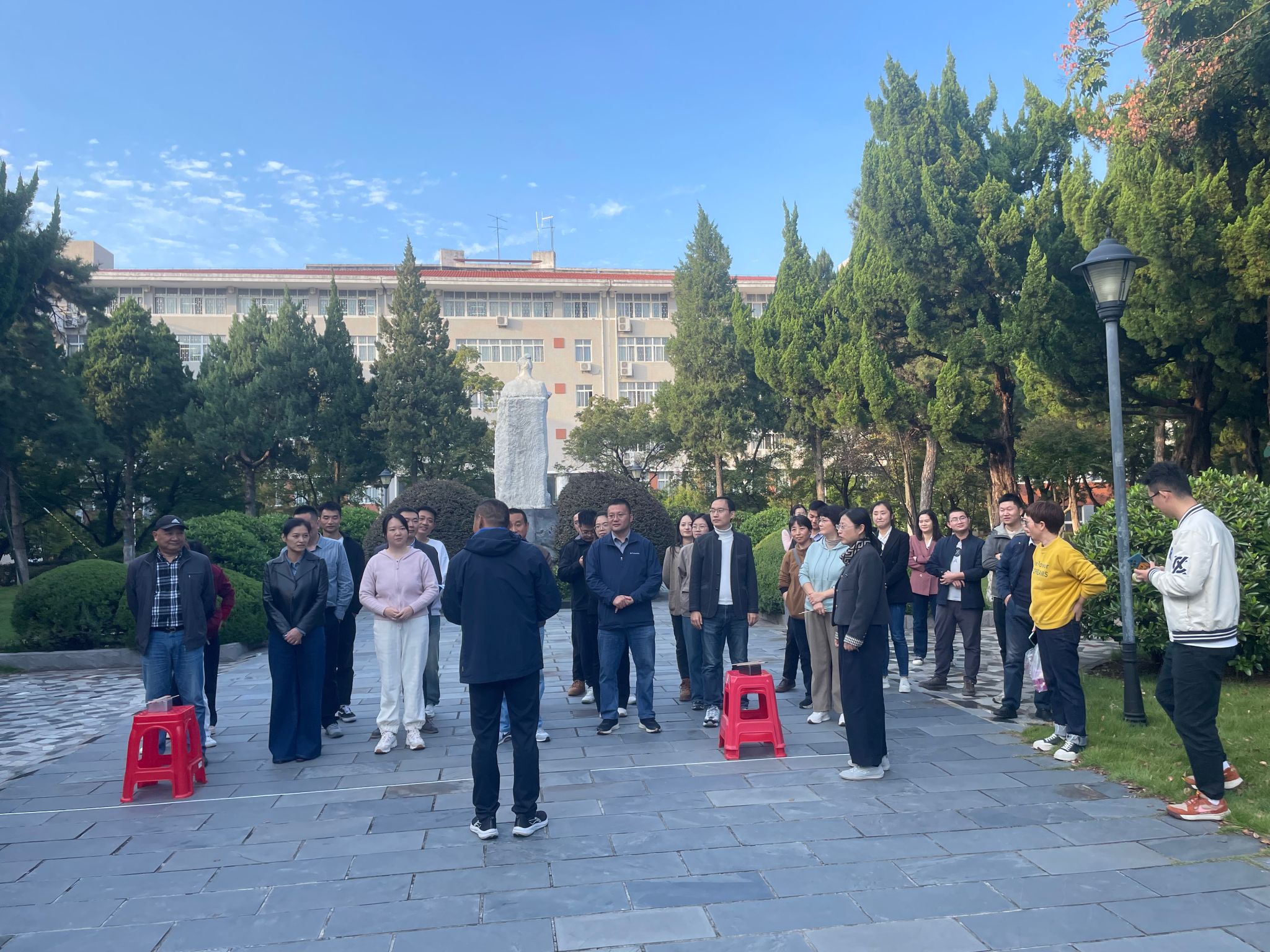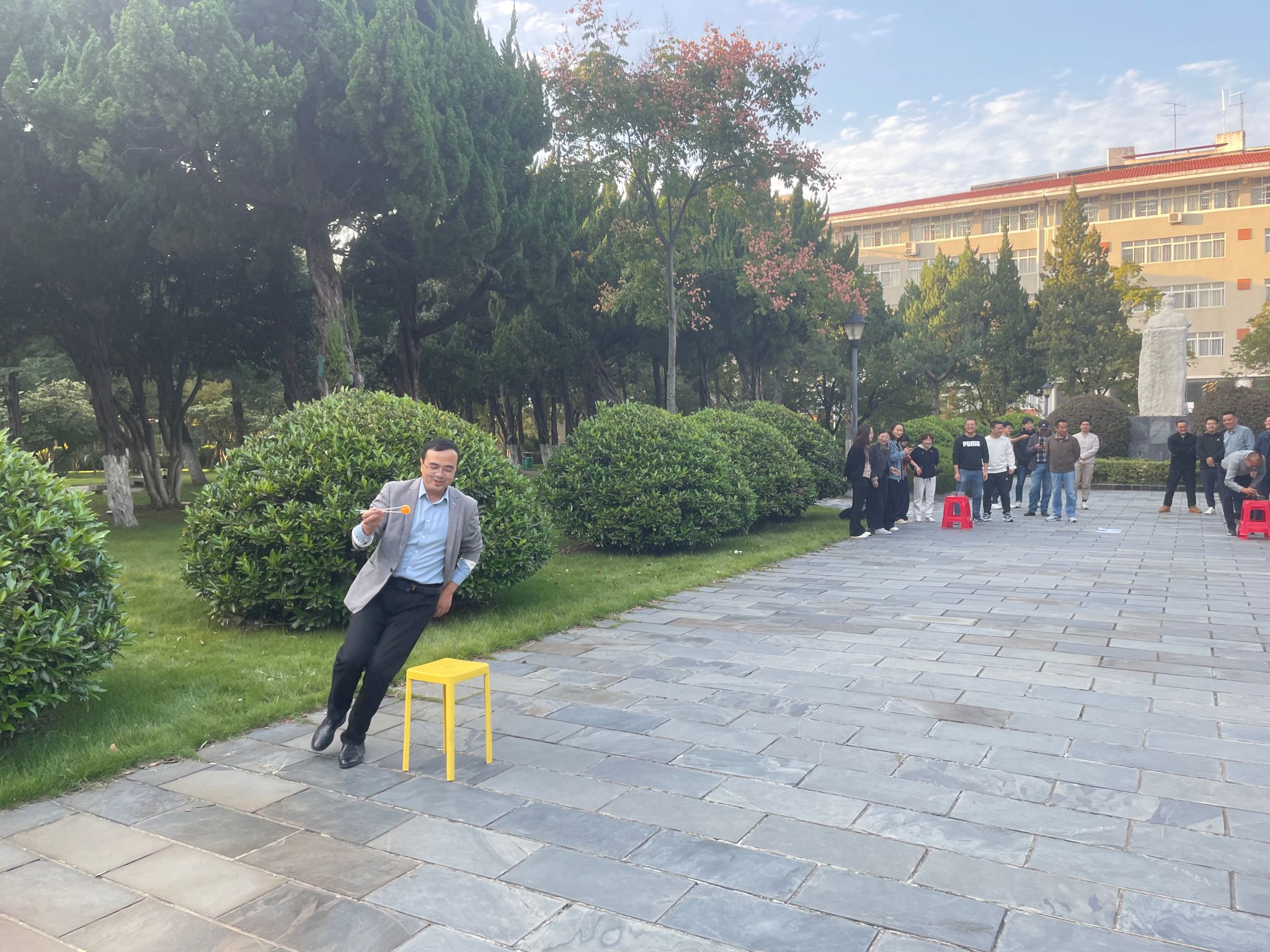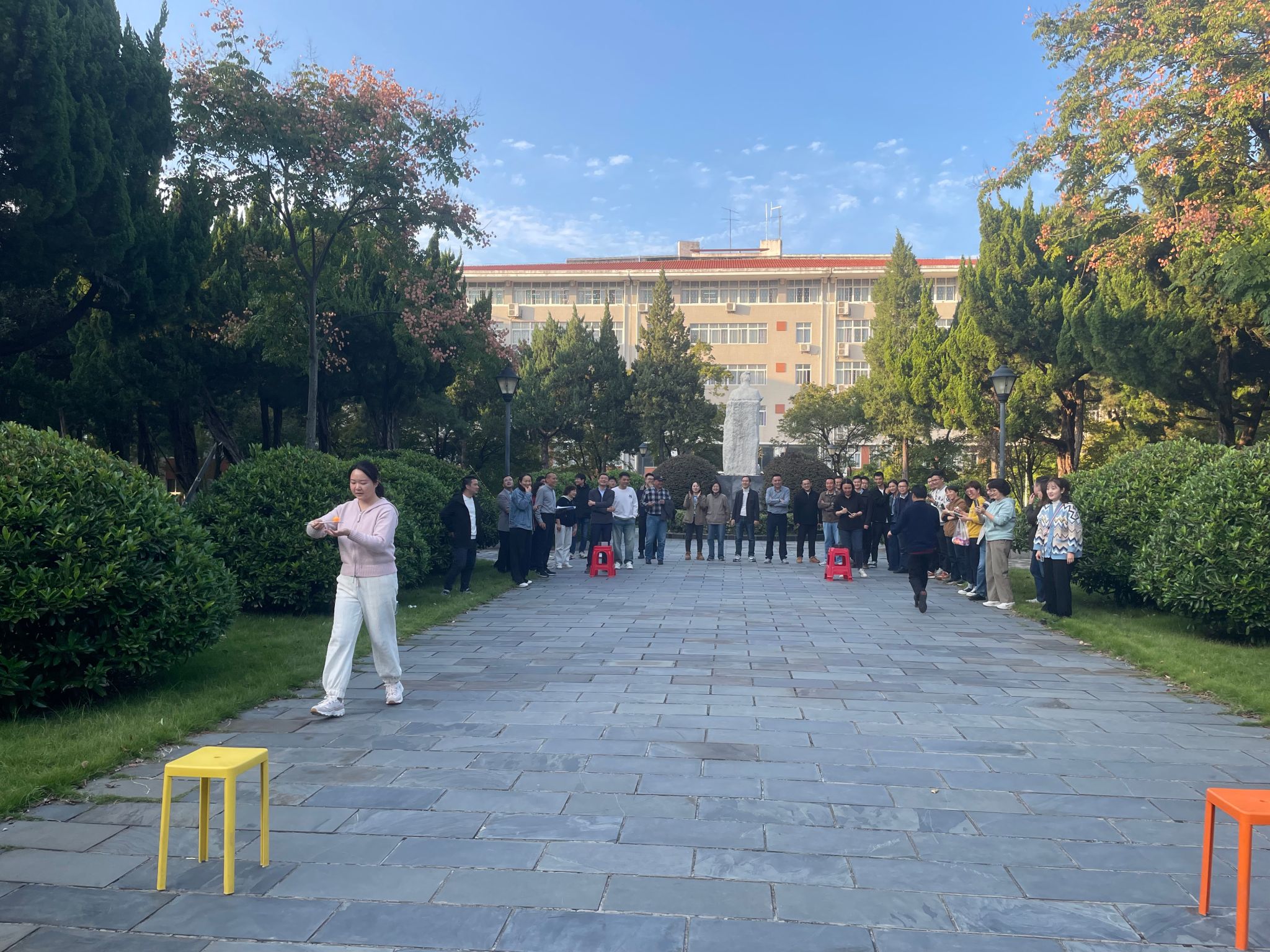 为庆祝学校96华诞,丰富教职工的文体生活,2024年10月25日,机关一工会在勤政楼楼下神农像处举办了“乒乒乓乓夹趣行,健康快乐伴我行”教职工夹乒乓球接力比赛。